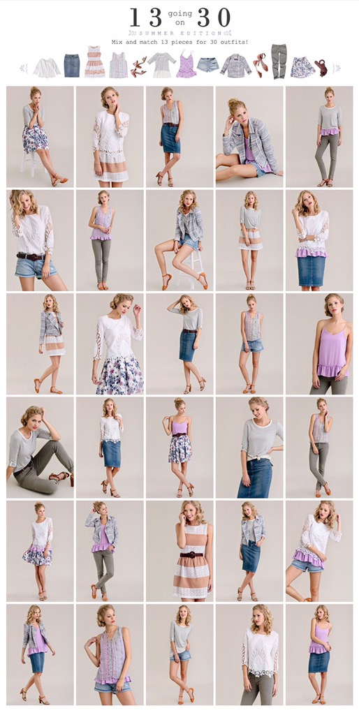 EN: I think all girls have this problem . Every morning we think :” What to wear today?” . I found the solution for one month. We need 13 pieces and imagination. I present you 30 outfits mix and match from 13 pieces. We need: 4 blouses, 2 skirts, one dress, 2 pairs of sandals, one jacket, 1pant, 1shorts and 1 belt.