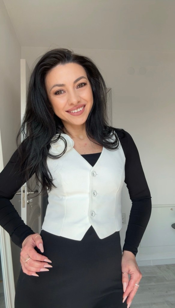 Inițial, m-am gândit la o eșarfă colorată, dar când am văzut această vestă albă cu detalii florale delicate, am știut că ea este piesa care va face diferența. Nu e „culoarea” pe care o plănuisem, dar este exact elementul care dă acea notă elegantă și sofisticată întregului look.